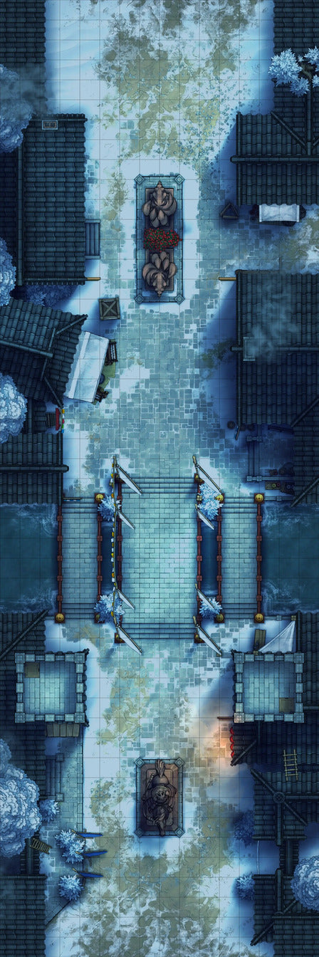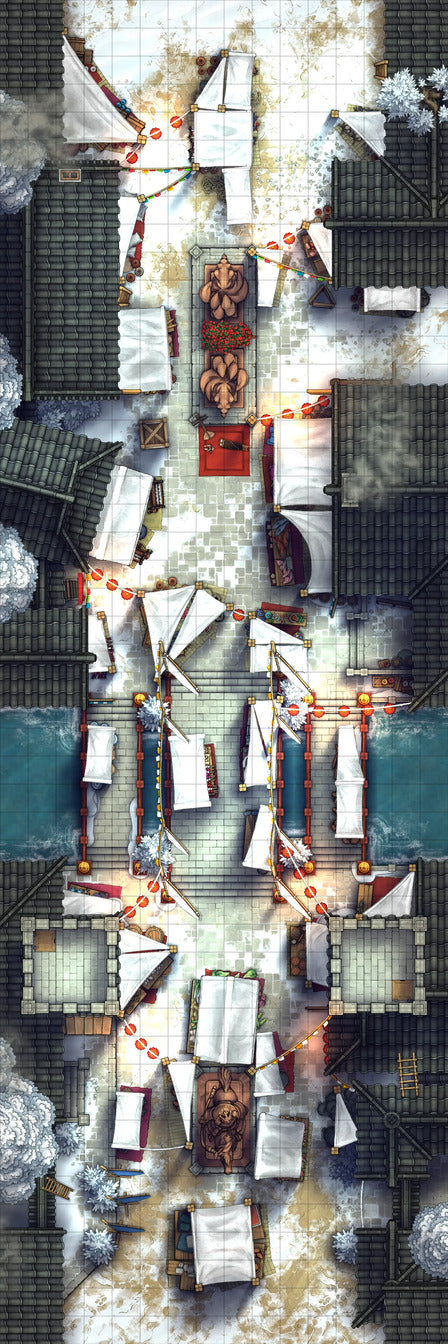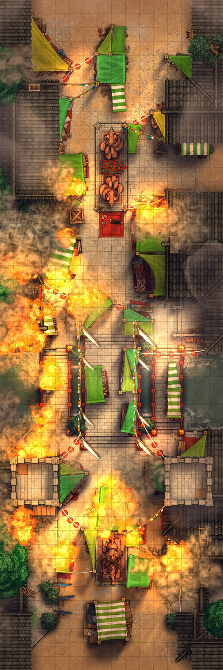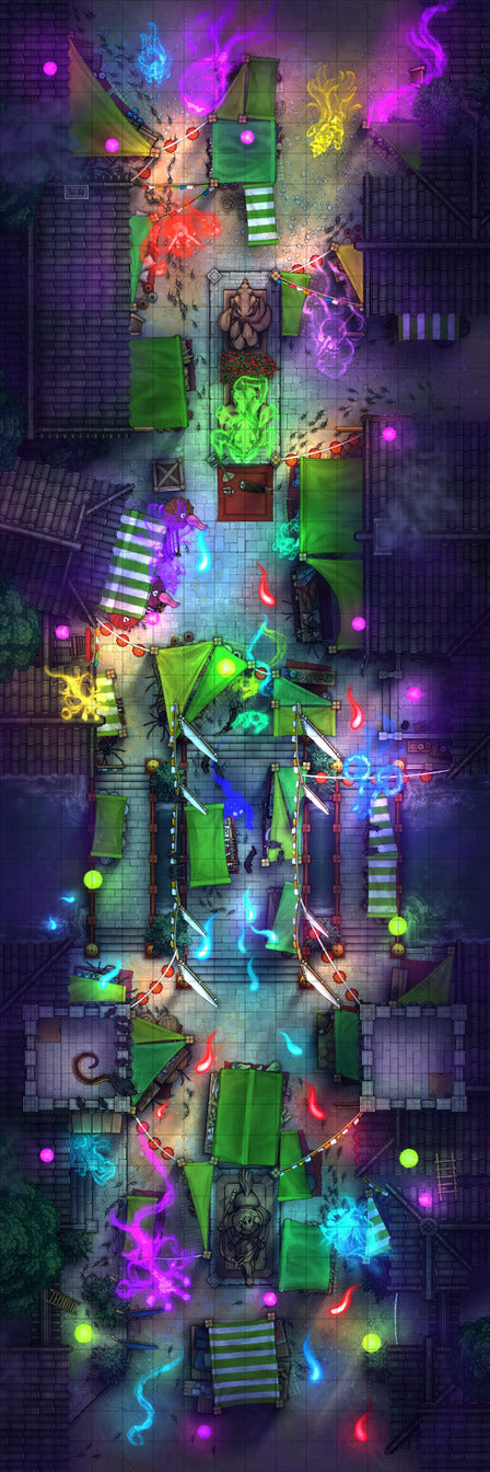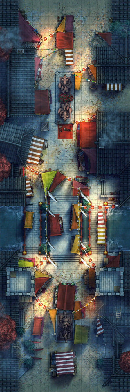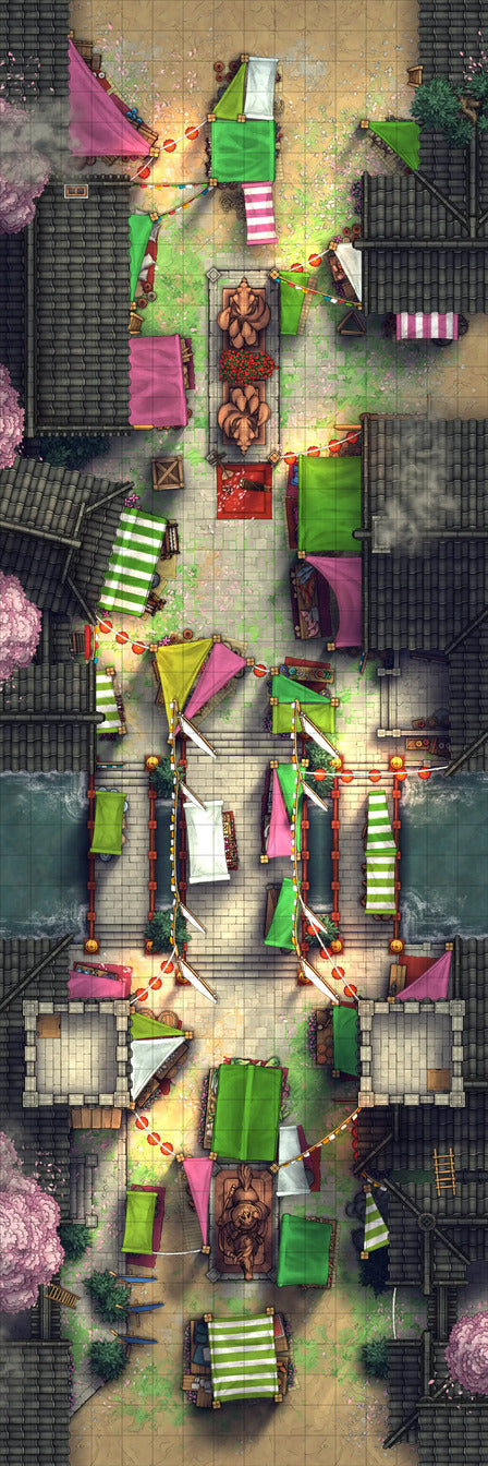 A vibrant Asian city market buzzing with hawkers & pick-pockets, hiding your players’ next fight! Toss your opponents off the bridge or scale the rooftops to sabotage the watchtower sentries, or wait until the new moon for the infamous Parade of One Thousand Demons!
